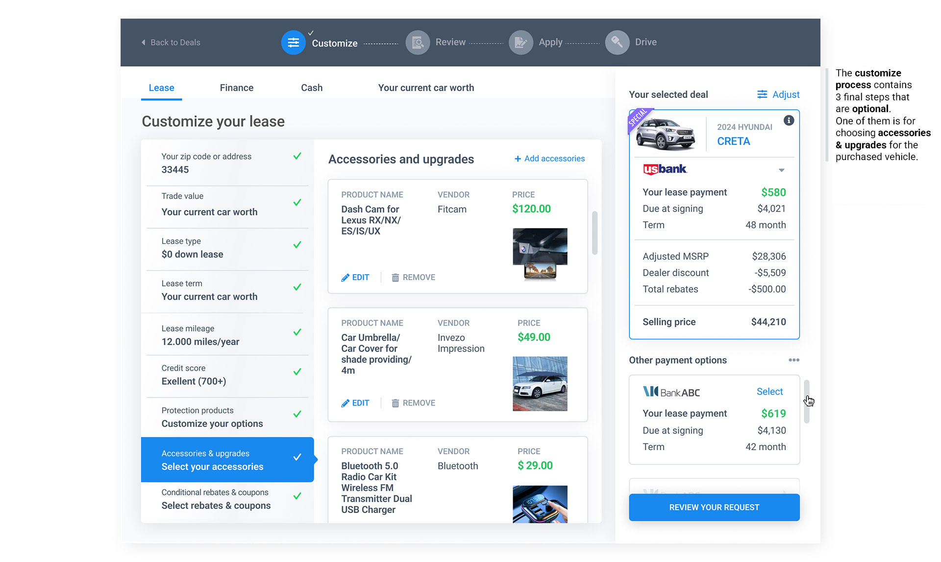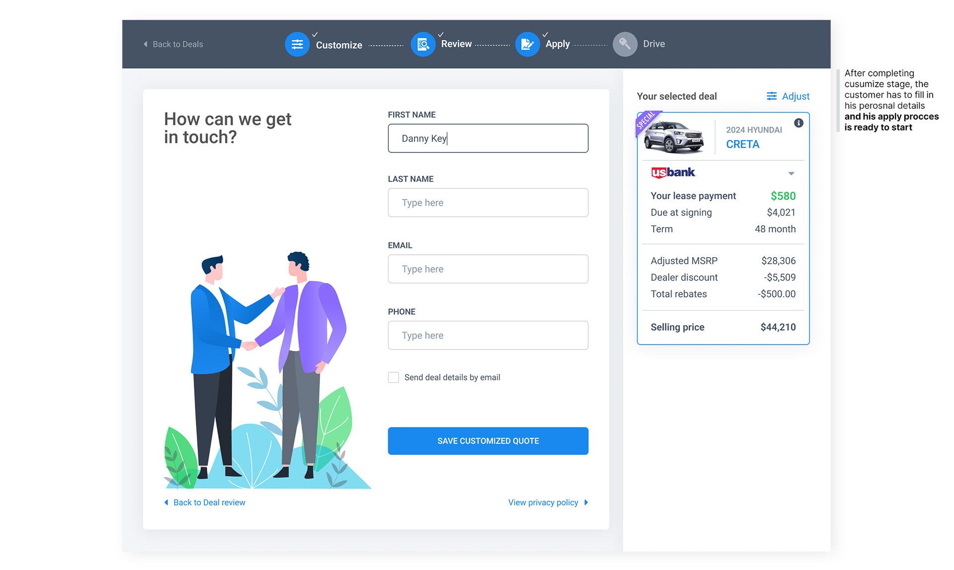 CarDeal works with a variety of car manufacturers, dealerships, and with financial institutions.
